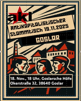 AKL Stammtisch - Antikaptalist*innen aller Harzer Gemeinden vereinigt euch, trinkt Limo und gestaltet mit uns die Zukunft. Wann: am 18. Nov. 2025 um 18 Uhr Wo: Goslarsche Höfe, Okerstraße 32, 38640 Goslar